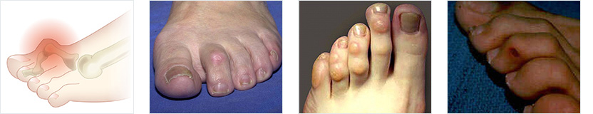 증상엄지발가락의 안쪽이 심하게 튀어나오고 뒤틀리는 심한 무지외반증과 함께 다른 발가락들도 심하게 뒤틀리고 탈구되며,